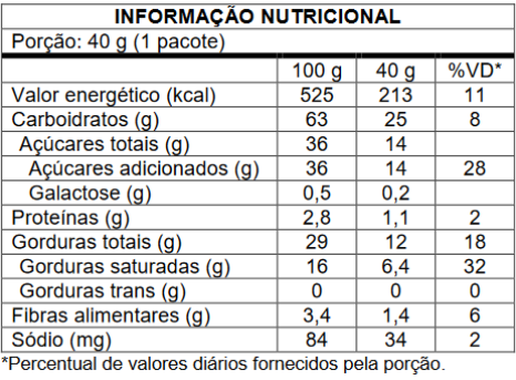 Recheio: ganache sabor chocolate (açúcar, gordura vegetal, cacau em pó, óleo vegetal, liquor de cacau, emulsificante lecitina de girassol e aromatizantes), amido, cobertura sabor chocolate (açúcar, gordura vegetal, cacau em pó, liquor de cacau, emulsificantes: lecitina de girassol e poliglicerol polirricinoleato, e aromatizante), açúcar, gordura vegetal, farinha de arroz, sal rosa do Himalaia, emulsificante lecitina de girassol, aromatizantes, fermentos químicos: bicarbonato de sódio, difosfato dissódico e di-hidrogenofosfato de cálcio e espessante goma xantana.