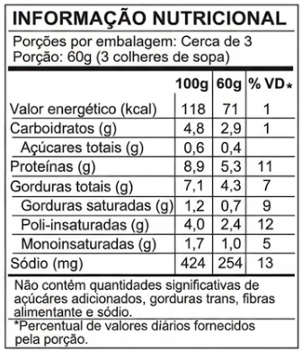 Água, proteína texturizada de soja, óleo de soja, aroma natural de atum, proteína isolada de soja, sal e corante natural de vegetais.