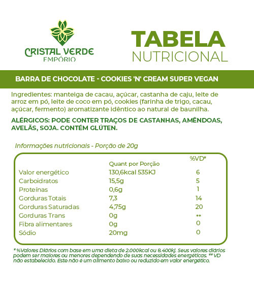 Manteiga de cacau, açúcar,castanha de caju, leite de arroz em pó, leite de coco, cookies (farinha de trigo, cacau açúcar, fermento) aromatizante idêntico ao natural de baunilha. Alérgicos:Pode conter traços de amêndoas, avelãs, soja.