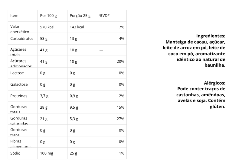 Uma excelente escolha para veganos, intolerantes à lactose e consumidores que estão em transição para uma alimentação vegetal sem abrir mão do prazer de um bom chocolate.