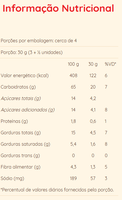 Amido de milho*, farinha de arroz, açúcar demerara, gordura de palma, cacau em pó, óleo de girassol, fécula de batata, leite de coco, fibras (inulina, fibra acácia e psyllium), manteiga de cacau, sal, estabilizante (maltitol), emulsificantes (lecitina de soja*, mono e diglicerídeos de ácidos graxos e goma xantana), fermentos químicos (bicarbonato de sódio, fosfato monocálcico e bicarbonato de amônio), antioxidante natural (extrato de alecrim), aromatizantes sintéticos idênticos ao natural e corante natural (betacaroteno).