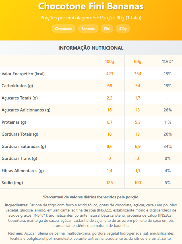 Massa: farinha de trigo enriquecida com ferro e ácido fólico, gotas de chocolate, açúcar, cacau em pó, óleo vegetal, glucose, amido, emulsificante lecitina de soja (INS322), estabilizante mono e diglicerídeos de ácidos graxos (INS471), aromatizantes, corante natural beta caroteno, proteína de cálcio (INS282).