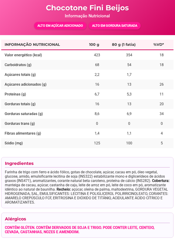Massa: farinha de trigo enriquecida com ferro e ácido fólico, gotas de chocolate, açúcar, cacau em pó, óleo vegetal, glucose, amido, emulsificante lecitina de soja (INS322), estabilizante mono e diglicerídeos de ácidos graxos (INS471), aromatizantes, corante natural beta caroteno, proteína de cálcio (INS282).