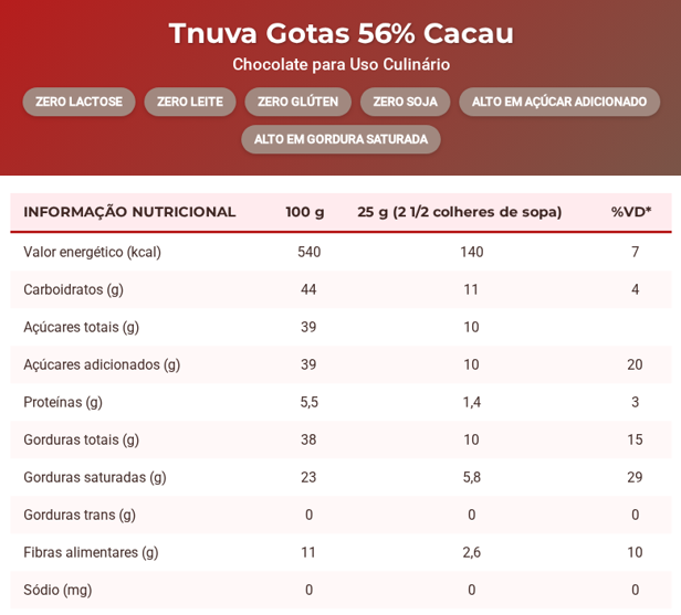 Elaboradas com massa de cacau, manteiga de cacau e açúcar, e livres de ingredientes de origem animal, essas gotas são veganas, sem glúten, sem lactose, sem soja e sem ovos. Produto certificado pela Sociedade Vegetariana Brasileira (SVB).