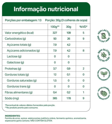 Farinha de arroz, açúcar, edulcorantes maltitol e stévia, fermento químico, aromatizante e espessante goma xantana.