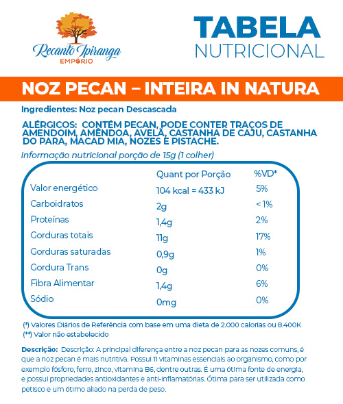 A Noz Pecan Inteira é uma oleaginosa de sabor marcante e textura delicada, considerada mais nutritiva que as nozes comuns. Rica em 11 vitaminas essenciais — incluindo fósforo, ferro, zinco e vitamina B6 —, ela é uma excelente fonte de energia e nutrientes para o dia a dia.
