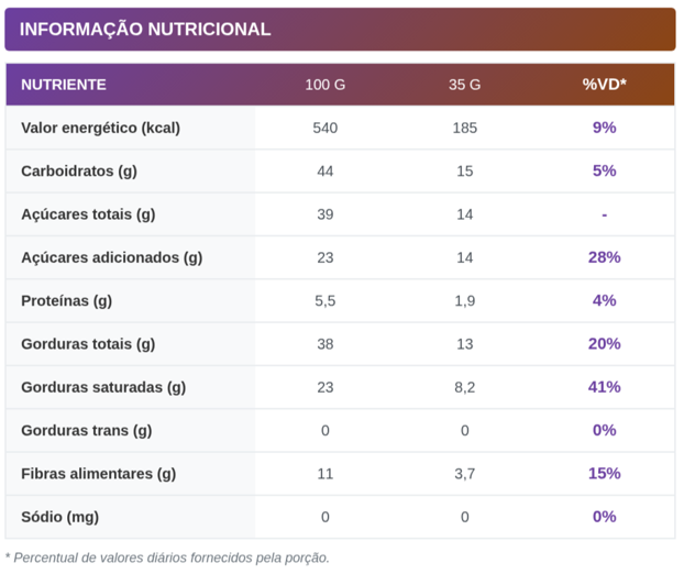 Em porção individual de 35g, é perfeito para presentear crianças e adultos que amam chocolate, mas precisam de uma alternativa sem leite e sem glúten. Um mimo que combina cuidado, sabor e qualidade.