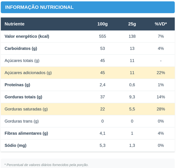 Chocolate 56% Cacau (massa de cacau, açúcar cristal, manteiga de cacau, fibra de tapioca (isomalto-oligossacarídeo de tapioca em pó), emulsificantes: lecitina de girassol e PGPR (INS 476) e aromatizante), açúcar cristal, manteiga de cacau, recheio de castanha-de-caju (gordura vegetal, açúcar cristal, farinha de castanha-de-caju, água, chocolate 56% Cacau (massa de cacau, açúcar cristal, manteiga de cacau, fibra de tapioca (isomalto-oligossacarídeo de tapioca em pó), emulsificantes: lecitina de girassol e PGPR (INS 476) e aromatizante)), farinha sem glúten (farinha de arroz, fécula de batata, fécula de mandioca e estabilizante goma xantana), wafer (farinha sem glúten (farinha de arroz, fécula de batata, fécula de mandioca e estabilizante goma xantana), óleo de girassol e açúcar).