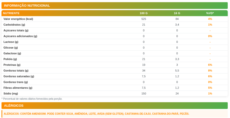 CONTÉM AMENDOIM. PODE CONTER CASTANHA-DE-CAJU, PECÃS E SOJA.