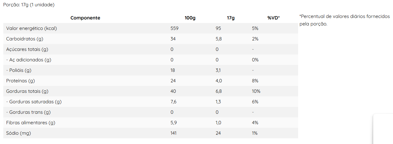 - 💪 Aporte Proteico: Cada unidade entrega 4g de proteína, auxiliando na recuperação muscular e manutenção da massa magra.
