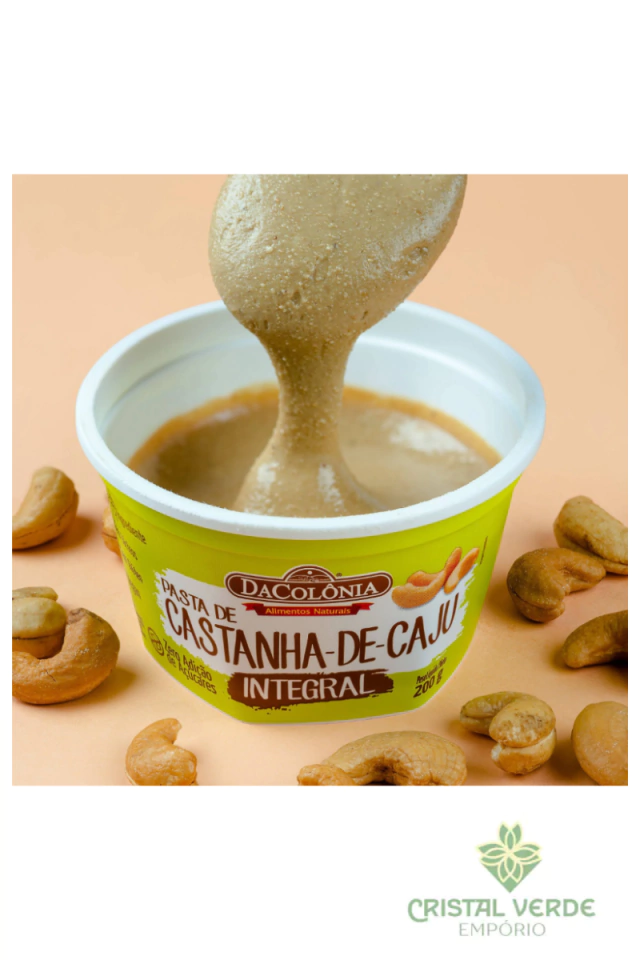 A pasta de Castanha de Caju DaColônia contém apenas um ingrediente: a castanha de caju. Esta pasta é uma aliada excepcional para a saúde e dietas equilibradas, uma vez que é rica em antioxidantes, vitaminas e minerais. Os minerais presentes desempenham papéis cruciais na prevenção de anemia e osteoporose, controle da pressão arterial, fortalecimento do sistema imunológico, e manutenção da saúde da pele, cabelos e unhas. Adicionalmente, sua riqueza em fibras e gorduras proporciona uma sensação de saciedade.
