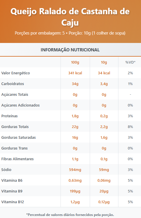 Alimento de castanha de caju sabor queijo parmesão (base de castanha: água e castanha de caju), amido de batata modificado, óleo de palmiste, óleo de coco, sal hipossódico, extrato de levedura, sal, vitaminas (B6, B9 e B12), aromatizante natural, acidulante ácido lático, conservante sorbato de potássio, corante natural urucum e antiumectante celulose microcristalina.