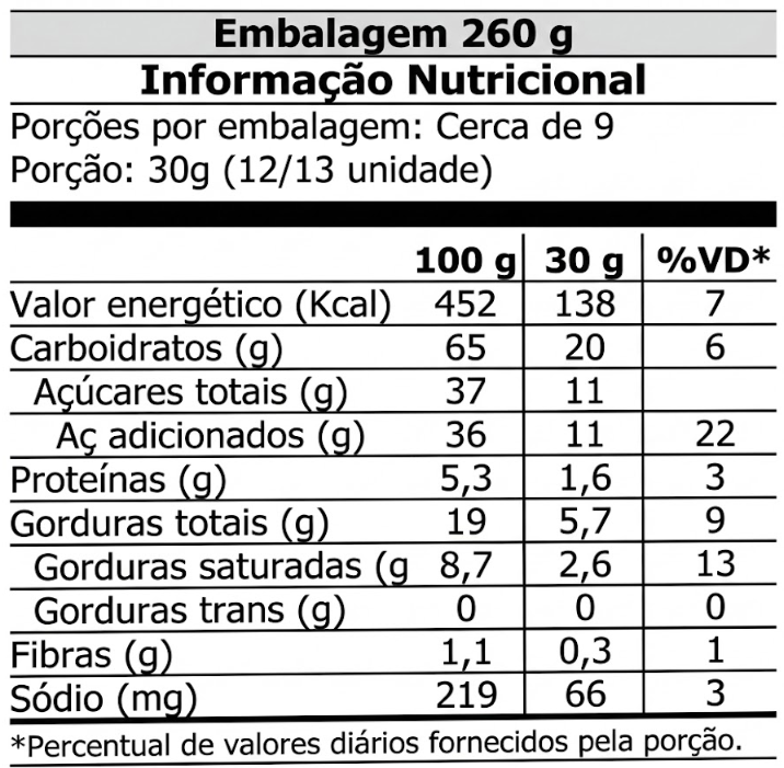 Açúcar demerara, farinha de trigo enriquecida com ácido fólico, gordura de palma, açúcar mascavo, óleo de girassol, farinha de soja, canela, sal, bicarbonato de sódio, emulsificante lecitina de soja e acidulante ácido cítrico.