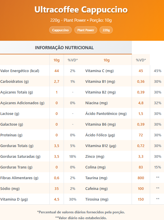 Desperte sua melhor versão com o Ultracoffee Cappuccino Plant Power. Uma fórmula inovadora que combina 100mg de cafeína natural e 800mg de taurina em um delicioso sabor cappuccino – cremoso, equilibrado e irresistível. Perfeito para quem busca energia, foco e desempenho durante o dia, sem abrir mão de ingredientes limpos e 100% vegetais.